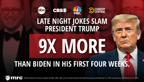 Through the first four weeks of President Donald Trump’s second term, the late night comedians have told 761 jokes about him. By contrast, in 2021, during President Joe Biden’s first four weeks in office, the late night comedians told a total of 88 jokes about the new chief executive, according to an MRC study.