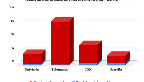 A la par con la caida del mercado bursátil debido al temor por el coronavirus de Wuhan, MRC Latino analizó la cobertura al tema de la economía en las cuatro cadenas noticiosas en español con mayor audiencia en Estados Unidos (Noticiero Univisión, Noticiero Telemundo, CNN en Español y Noticiero Estrella TV), desde el 25 de febrero hasta el 24 de marzo de 2020.