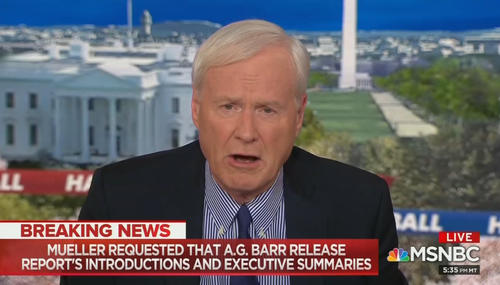 At the 7:13 p.m. Eastern mark of Tuesday’s Hardball, MSNBC host Chris Matthews sent his show into rolling coverage for the rest of the hour (and thus making the entire show commercial-free) over stories in The New York Times and Washington Post about Special Counsel Robert Mueller having expressed concerns to AG Bill Barr about his March 24 letter on the Trump-Russia probe’s principal conclusions…