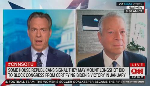 As global warming activist and former Democratic Vice President Al Gore appeared as guest on Sunday''s State of the Union, CNN host Jake Tapper declared that President-elect Joe Biden's leadership is needed in fighting climate change, and cued up his liberal guest to call for action on the issue from Biden in his first 100 days.