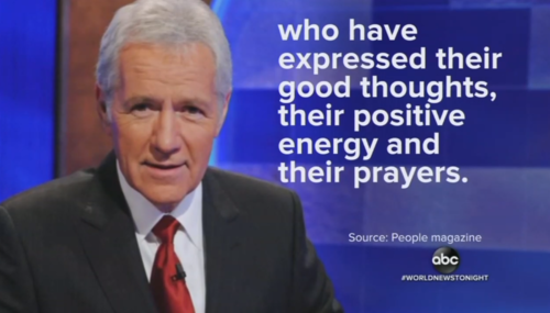 In an interview with People magazine out Wednesday, Jeopardy! host Alex Trebek credited the prayers of millions of his fans for helping him in his fight against stage-four pancreatic cancer, now in “near remission.” Yet, while ABC’s World News Tonight touted Trebek’s praise, the CBS Evening News ignored that part of Trebek’s comments and NBC Nightly News edited it out of the quotes read and video…