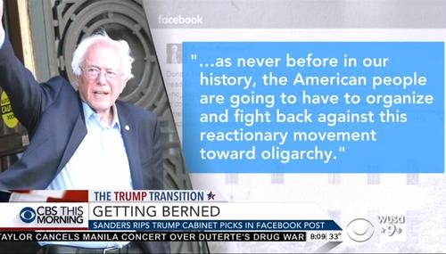 Wednesday's CBS This Morning deemed a Facebook post from Senator Bernie Sanders worthy of a 55-second short report. Norah O'Donnell noted how the left-wing politician "criticized some of the Cabinet picks" from President-Elect Donald Trump. She quoted from Sanders, who asserted that "the American people are going to have to organize and fight back against this reactionary movement toward…
