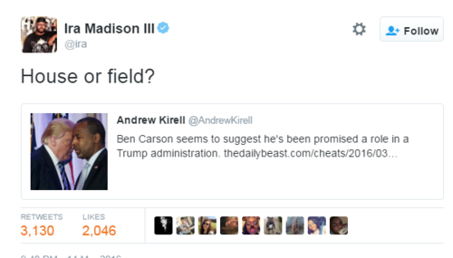 Replying to a tweet about a story reporting that Ben Carson hints he was promised a position in a potential Trump administration, MTVNews senior writer Ira Madison III quipped "House or field?"