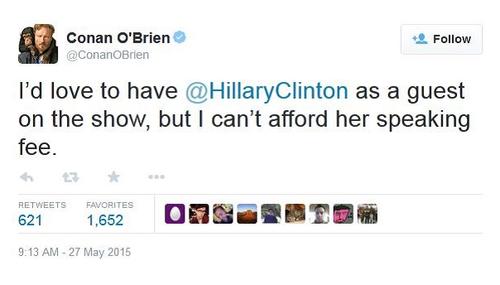 TBS host Conan O'Brien took a new comedic shot at Hillary Clinton in a Wednesday post on Twitter – specifically, six-figure speaking fees that the former first lady charges; and, along with her husband's speaking engagements, has netted the couple $30 million in 16 months. O'Brien wrote, "I'd love to have @HillaryClinton as a guest on the show, but I can't afford her speaking fee."