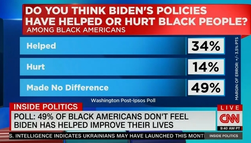 A new Washington Post-Ipsos poll of 1,200 black Americans asked whether President Biden's policies helped, hurt, or made no difference to black people. Almost half -- 49 percent -- picked "made no difference." Ouch. When they displayed this poll result on CNN's Inside Politics on Thursday, I had to joke that this poll would probably being buried inside the paper. And it was -- placed…