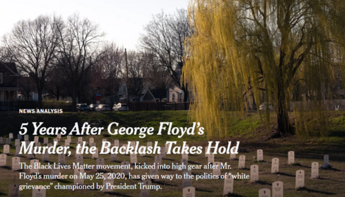 The New York Times ran a Memorial Day “news analysis” marking five years since George Floyd was killed while being detained by police in Minneapolis in the summer of 2020: “5 Years After George Floyd’s Murder, the Backlash Takes Hold -- The Black Lives Matter movement, kicked into high gear after Mr. Floyd’s murder on May 25, 2020, has given way to the politics of ‘white grievance’…