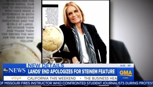 Good Morning America on Friday actually noticed a controversy involving the very pro-abortion feminist Gloria Steinem. Clothing company Lands' End was forced to apologize for featuring Steinem in its spring issue. Reporter Rebecca Jarvis explained what caused the outrage from pro-life Americans: “An interview with feminist, journalist and political activist Gloria steinem after customers flooded…