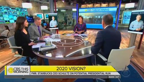 Liberal journalists are worried. CBS This Morning on Tuesday continued the onslaught against Howard Schultz and his potential 2020 independent bid. Very worried that the former Starbucks CEO could reelect Donald Trump, the show’s hosts played a clip of a heckler calling him an “a**hole” and wondered if would reconsider.