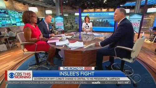 Nothing controversial here. CBS This Morning co-hosts on Thursday breezily questioned 2020 presidential candidate Jay Inslee, offering little in the way of challenges to the Washington governor's plans to end the filibuster and the electoral college and to have Medicare for all. Instead, the journalists offered softballs with little skepticism.