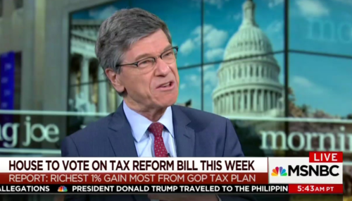 On Monday’s Morning Joe, the panel brought on liberal economist Jeffrey Sachs to talk about the Republican tax reform bill currently making its way through Congress. Somewhat predictably, Sachs used his platform to attack the plan as a form of “theft,” the “biggest heist in history,” and a plot by America’s “richest gazillionaires” to “bankrupt” the country for their own personal enrichment.…