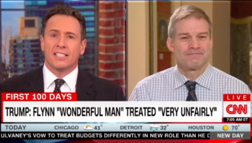 On CNN's New Day Thursday, host Chris Cuomo attacked Republican Ohio Representative Jim Jordan over his party's handling of leaked allegations of communications between former National Security Adviser Michael Flynn and Russian officials, which led to Flynn's resignation on Monday.