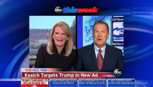 Viewers tuning into Sunday’s edition of ABC’s This Week witnessed matters getting awkward towards the tail end of Republican presidential candidate John Kasich’s interview with co-host Martha Raddatz as Kasich attempted to flatter her by insisting that she condemn Donald Trump and half-heartedly telling her he wished “you were in the race” for President because he’d support her.