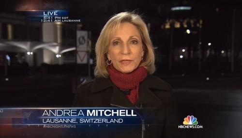 On Tuesday, NBC’s chief foreign affairs correspondent Andrea Mitchell took time out of her NBC Nightly News report from Switzerland on the Iranian nuclear talks to hail Secretary of State John Kerry as someone who “doesn’t give up easily” and gush that a local pizzeria in the town where the talks are being held has decided to name “a pizza after him.”