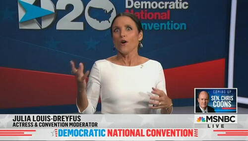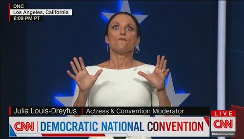After portraying the United States under Donald Trump as an unrelenting hellscape, the Democratic National Convention on Thursday closed out with attempts at comedy. Seinfeld star Julia Louis-Dreyfus anchored the 9 PM with painful jokes attempting to get people to text the campaign: “An easy way to remember 30330 is that is the year Donald Trump will finally release his tax returns.…
