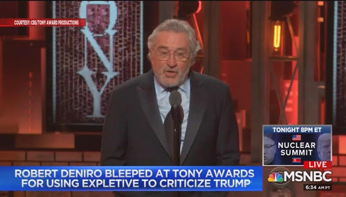 During the 72nd Annual Tony Awards, on June 10, Robert De Niro stood before a live audience and CBS cameras. Before introducing Bruce Springsteen, the actor announced , “I’m going to say one thing, fuck Trump!” He continued, “It’s no longer down with Trump. It’s fuck Trump.” Because what is an award show without vulgar, smearing politics?