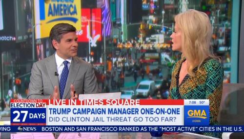 Wednesday’s Good Morning America was all in for Hillary Clinton. From the complete absence of any story on the Wikileaks e-mails on the Clintons, to a hostile interview from George Stephanopoulos to Kellyanne Conway. Talking to Donald Trump's campaign manager, the former Clinton staffer repeatedly grilled Conway about an anti-Hillary ad the Trump campaign had put out. “You’ve got a huge gap with…