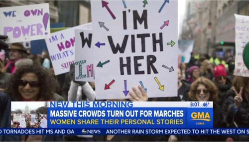 The Sunday following the anti-President Donald Trump Women’s March on Washington, network news rushed to spin the event as an inclusive event about putting the president on notice. “[Trump will] be confronting images, however, like this,” hyped Paula Farris on Good Morning America, “Hundreds of thousands of women, and men, hitting the streets.” There was no talk of the obscene parts of Ashley…