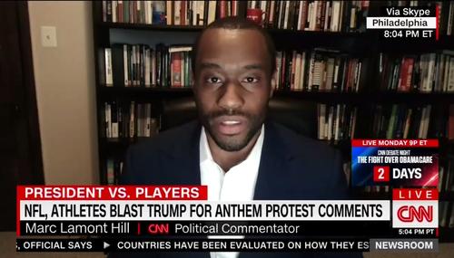 On Friday's CNN Tonight, during a discussion of President Donald Trump speaking out against Colin Kaepernick and other athletes who have kneeled instead of standing for the national anthem, far-left CNN political commentator Marc Lamont Hill admitted that he also does not stand for the anthem. Hill: "I come on here every week and talk about white supremacy -- I say Donald Trump is a white…
