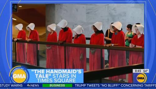 ABC and NBC this week have both promoted the apocalyptic, liberal series The Handmaid’s Tale as “resonate and “not just a show.” Good Morning America on Wednesday touted the use of the costumes from the program in pro-abortion protests. GMA co-host Michael Strahan gushed over two of the importance of the show, which portrays a dystopian future where women are oppressed.