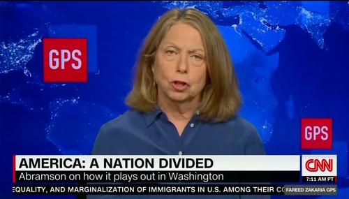 Appearing as a guest on Sunday's Fareed Zakaria GPS on CNN, former New York Times executive editor Jill Abramson blamed a Republican "rage machine" for the level of political polarization that currently exists, and complained about how congressional Republicans are conducting business. She also oddly claimed that Democrats were not partisan in their reaction to President Donald Trump's nomination…