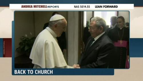 On her Monday MSNBC show, host Andrea Mitchell gushed over Cuba's Communist dictator possibly heading "back to Church" and returning to "his Jesuit roots" after a meeting with Pope Francis at the Vatican: "Cuba's president Raul Castro is praising Pope Francis for helping to thaw relations between U.S. and Cuba....he said that the Pontiff inspired him to consider returning to the Catholic Church."