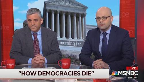 MSNBC's Morning Joe isn't one to shy away from hyperbole when talking about life in Trump's America and Monday's show was no exception. The Monday panel was joined by Harvard professors Steven Levitsky and Daniel Ziblatt to discuss the state of democracy and American institutions as their book, How Democracies Die, was being released in paperback.