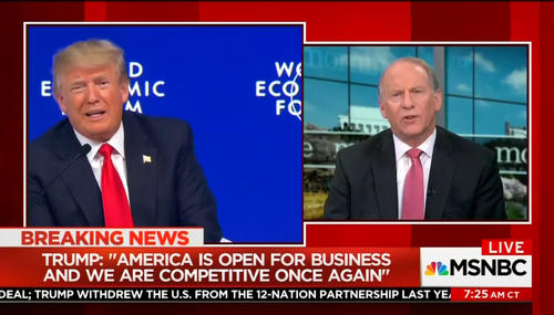 On Friday’s Morning Joe, a panel of MSNBC commentators watched and subsequently struggled to critique President Trump’s speech in Davos, Switzerland at the World Economic Forum. Joe Scarborough spoke slowly and reluctantly as he recounted the topics covered in the speech, even daring to agree with the President’s characterization of an America-first policy.