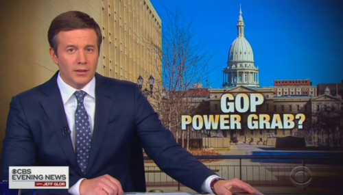 They were a little late to the game but during Wednesday’s CBS Evening News, the network used Democratic Party talking points to stoke fears of a Republican Party power grab in the state of Michigan. And as with their network competitors (ABC and NBC), they too offered little explanation of exactly how the GOP was threatening Democratic power.