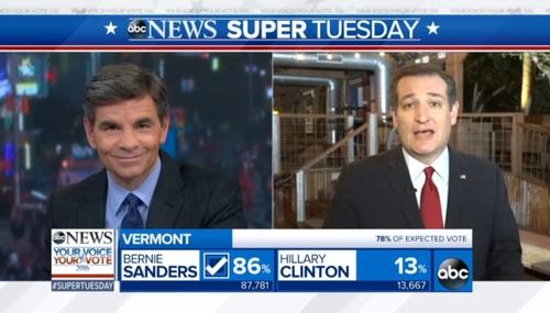 Appearing on ABC’s live Super Tuesday coverage, Ted Cruz openly mocked former Democratic operative turned journalist George Stephanopoulos. A skeptical Stephanopoulos questioned Cruz’s path to the nomination, despite his wins in Oklahoma and Texas: “Marco Rubio is staying in the race. John Kasich is staying in the race. Ben Carson is staying in the race.”