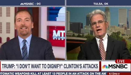 Tom Coburn wasn’t having any of Chuck Todd’s bias. The former Republican Senator appeared on MSNBC, Thursday, to discuss Hillary Clinton’s speech on the alt-right movement. After Todd repeatedly pushed Todd on Republican connections to extremism, Coburn called out the network’s liberal spin: “That's just like saying if somebody hires you, Chuck, and NBC's viewpoint politically is far left anyway…