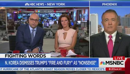 On MSNBC Live Thursday, host Ali Velshi refused to listen to his guest, Rep. Trent Franks (R-AZ) after he started to give the liberal host an answer he didn’t like. Hosts Ali Velshi and Stephanie Ruhle first asked the member of the Armed Services Committee about Trump’s handling of North Korea’s threat against the U.S. territory of Guam.