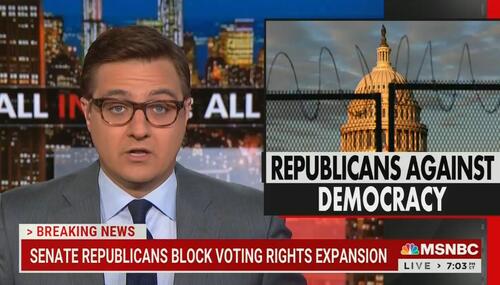 Host Chris Hayes had another meltdown on MSNBC's All In Tuesday night. This time over Republican’s so-called “war against democracy” that only exists in the left-wing anchor's wild imagination. Hayes went on a wild rant in the wake of Senate Democrats' failed attempt to hijack the entire electoral system.