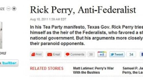 Republican presidential aspirant Gov. Rick Perry practically wants to return America to the Articles of Confederation. That essentially is the argument of Newsweek/Daily Beast homepage editor David Sessions in an August 18 article: