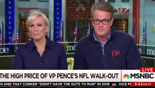 On Monday’s Morning Joe, hosts Joe Scarborough and Mika Brzezinski, joined by MSNBC political analyst Steve Schmidt, got very riled up over an imaginary political scandal that Vice President Mike Pence supposedly was at the center of and ended up angrily blaming him for holding up phantom ambulances and job interviews in a Bridgegate-style conspiracy, all by refusing to sit through an NFL game…