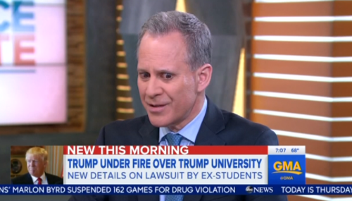Thursday’s Good Morning America featured the Democratic Attorney General of New York, Eric Schneiderman, who has led the charge on the 2013 Trump University case in the state. The prominent Clinton supporter insisted to co-host George Stephanopoulos (who is also a notorious Clinton Foundation donor) that the case was “not political!”