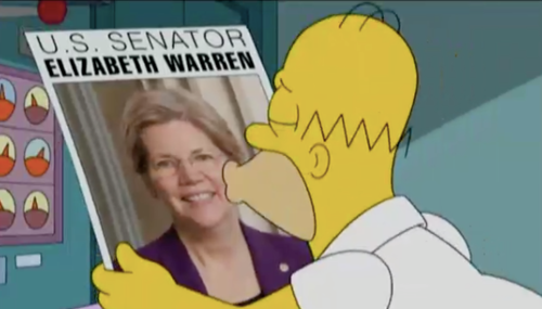 Viewers were met with an ugly sight in the opening scene of the latest episode of The Simpson's, "The Girl Code." Marge makes a surprise visit to the plant to deliver Homer’s lunch. In an attempt to make his office “a little more Marge-friendly,” Homer jumps up to hide a poster of Sen. Elizabeth Warren (D-MA), putting it away with a kiss and saying, “See you soon, Liz-Liz.” BLEH!