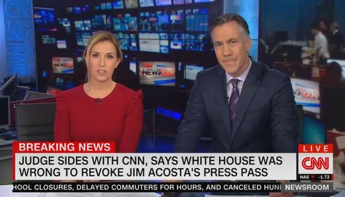 Not surprisingly, CNN was in an exuberant mood on Friday morning after federal judge Timothy Kelley ordered their chief White House correspondent Jim Acosta to have his White House press credentials restored following the Trump administration’s decision on November 7 to yank his pass following yet another act of showboating by Acosta hours earlier at a White House press conference.