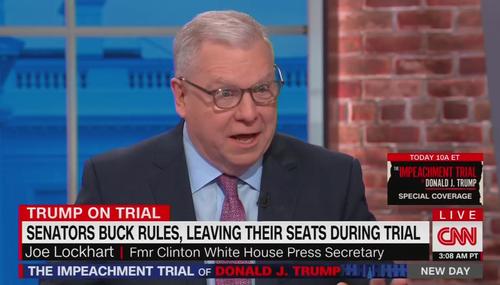 A week after being roasted for tweeting a fake conversation between Republican senators, CNN political commentator and former Clinton White House Press Secretary Joe Lockhart claimed Wednesday night during the Senate trial’s dinner break that an argument used by Trump legal team member Alan Dershowitz was “un-American” and akin to those used by “authoritarian people” to justify “genocide.”