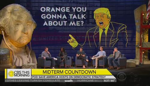The co-hosts of CBS This Morning on Tuesday plotted strategy for the Democrats in the 2018 midterms, talking to the liberal co-hosts of the podcast Pod Save America, Jon Favreau and Dan Pfeiffer. Together, they wanted to know just what Democrats could do to take the House and the Senate. This Morning co-host John Dickerson asked, “To the extent that Democrats can have a message, what should it be…
