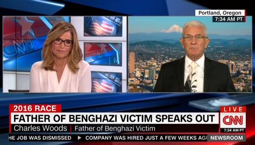 On Tuesday's CNN Newsroom, host Carol Costello repeatedly attempted to get Charles Woods, father of U.S. Navy S.E.A.L. Tyrone Woods, who died in Benghazi, to ask Trump to “apologize” for his comments to the Khans. Instead of taking the bait, Woods turned the tables and called on someone else to apologize instead: "When Hillary Clinton on several occasions has called the Benghazi victims' families…