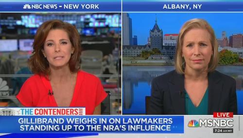 MSNBC Live host Stephanie Ruhle on Wednesday welcomed New York Senator Kirsten Gillibrand for a softball interview to remind America that she is running for president and to allow her some free air time to accuse the National Rifle Association of not caring about dead children and for the host to praise Gilibrand's ability to distance herself from the NRA.