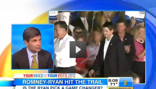 Good Morning America anchor George Stephanopoulos on Monday kicked off the program by tagging Paul Ryan as "the former prom king that once drove the Weinermobile." [See video below. MP3 audio here.] The ex-Democratic operative turned TV host also authoritatively declared that "the White House is actually pretty pleased by the choice of Paul Ryan because they do see him as a target." (What else…