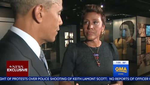 On Friday’s Good Morning America, anchor Robin Roberts interviewed President Obama and the First Lady from the new addition to the Smithsonian, the National Museum of African American History and Culture. Roberts used the museum’s theme as a starting point to ask the president what the thought about the rioters, looters and protesters in Charlotte, North Carolina. Except Roberts didn’t set it up…