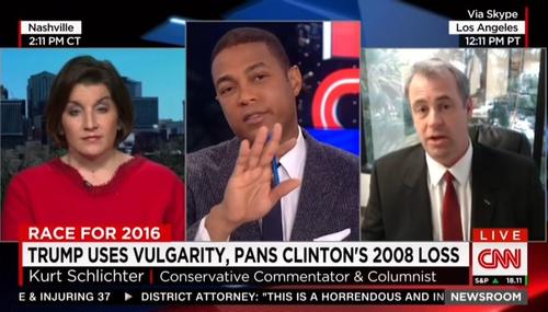 The lead segment in the 3:00 p.m. Eastern hour of Tuesday’s CNN Newsroom featured quite the display of verbal fireworks as conservative writer Kurt Schlichter angered fill-in host Don Lemon when he invoked the Clinton sex scandals of the 1990's with former President Clinton turning “his intern into a humidor” while discussing vulgar comments made by Donald Trump.