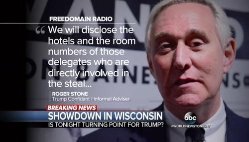 Instead of focusing on the latest developments in Wisconsin concerning the Republican presidential primary, ABC’s World News Tonight used 25 seconds to eagerly promote Donald Trump supporter/former adviser Roger Stone’s threat to expose the hotel room numbers and locations of delegates to the Republican National Convention that won’t be supporting the billionaire candidate.