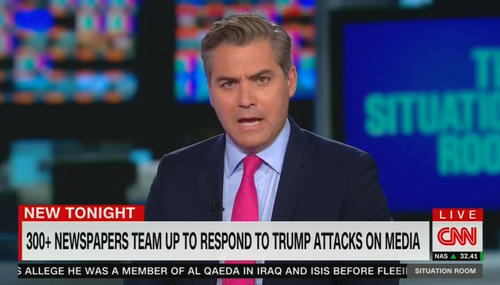Thursday’s nationwide collusion effort by about 350 newspapers didn’t do much of anything to convince skeptics that they’re not out to get President Trump. Rather, editorials denouncing Trump showed the arrogant yet thin-skinned nature of the media. And CNN’s Jim Acosta perfectly encapsulated that on The Situation Room. Filling in for Wolf Blitzer, Acosta had the show shift gears to “a very…