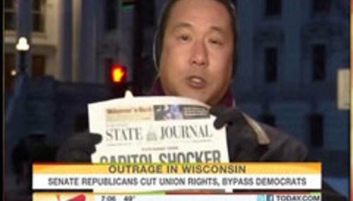 NBC's Meredith Vieira opened Thursday's Today show alerting viewers that Republicans in Wisconsin had caused a "capitol chaos" with a "surprise maneuver" to pass a "controversial budget proposal without Democrats" and her colleague Ann Curry, in teasing a John Yang story, did her one better calling the vote an "outrage."