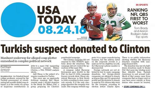 ABC, CBS, and NBC's morning and evening newscasts on Wednesday all punted on mentioning USA Today's above-the-fold scoop about how an "Istanbul-based college professor...accused by the Turkish government of coordinating last month's failed coup attempt, is at the center of a group of suspicious 2014 contributions to a super PAC supporting...Hillary Clinton."