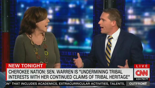 Things grew tense Monday night on CNN’s Erin Burnett OutFront (with fill-in host Jake Tapper) as one of the rare CNN conservatives in political commentator Scott Jennings threw down with The Nation’s Joan Walsh over Massachusetts Democratic Senator Elizabeth Warren’s attention-grabbing attempt to reinforce her minuscule Native American heritage.