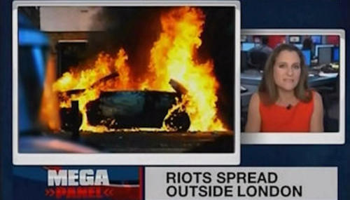 As rioters in England set buildings aflame, hurl stones into local shops, and rip flat screen TVs off of store walls, Reuters editor-at-large Chrystia Freeland viewed Prime Minister David Cameron's fiscal policies as the "really radical" culprit.